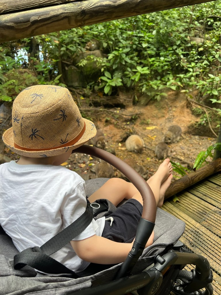 Wir haben den Wagen mitgenommen, weil wir die naive Idee hatten, dass das Kind seinen Mittagsschlaf dort macht. Spoiler: bei so einem interessanten Zoo geht die Wahrscheinlichkeit, einfach einzuschlafen, gegen Null. Das war übrigens neben den Wegen am Flughafen das erste und einzige Mal, dass wir den Kinderwagen benutzt haben.