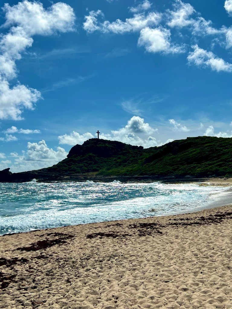 Von der Unterkunft ist es nur ein Katzensprung bis zum (nun aber wirklich) östlichsten Punkt der Insel. Dort kann man bis zu einem Gipfelkreuz hochwandern, wobei das Wort Wanderung hier maßlos übertrieben ist man von einem längeren Spaziergang mit moderater Steigung sprechen kann. Wir haben dennoch darauf verzichtet, da selbst der Spaziergang bei sengender Hitze mit Kleinkind nicht geeignet gewesen wäre.